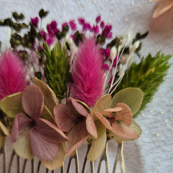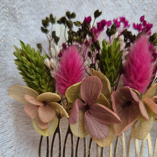 Découvrez les peignes artisanaux, soigneusement confectionnés à la main pour sublimer vos coiffures avec élégance. Chaque pièce est ornée de fleurs stabilisées, telles que des hortensias intemporels et dautre fleurs qui conservent leur beauté naturelle sans faner. Dans les tons vert beige et rose . Fixées sur des structures en métal doré, ces créations uniques allient raffinement et durabilité.