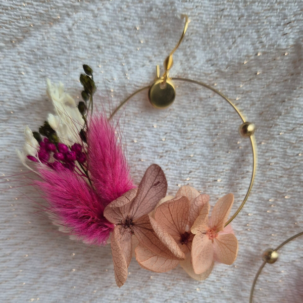 Cette paire de boucles d'oreilles est une véritable ode à la nature et à l'artisanat minutieux. Réalisées avec soin pendant plus de 2 heures, elles sont composées de fleurs stabilisées, dont de sublimes hortensias , accompagnés d’un délicat mélange de feuillages raffinés dans les tons vert beige et rose