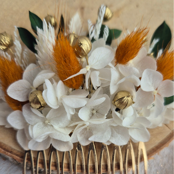 Sa base en acier inoxydable doré offre une bonne tenue dans les cheveux tout en restant discrète. L’ornement floral est composé de délicats hortensias blancs stabilisés, apportant de la légèreté, accompagnés d'eucaliptus vert et de fleurs séchées couleur terra cotta pour une touche chaleureuse. De petites touches dorées, scintillantes, viennent sublimer l’ensemble avec subtilité.