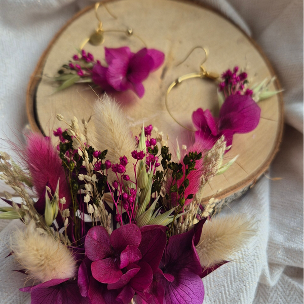 Fleurs naturelles stabilisées (fuchsia, beige, vert)