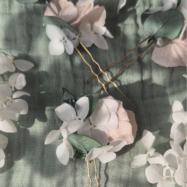Apportez une touche florale et délicate à votre coiffure avec ce lot de trois pics à chignon ornés de fleurs stabilisées. Composés d’hortensias blancs et beige pâle, accompagnés de feuillage d’eucalyptus vert tendre, ces accessoires sont parfaits pour sublimer une coiffure de mariée, un chignon de cérémonie ou une tenue bohème chic.