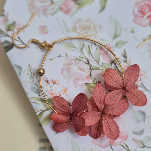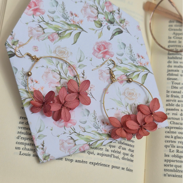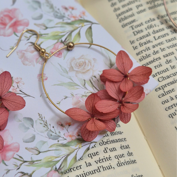 Légères, délicates et aériennes, ces créoles en acier inoxydable sont ornées de véritables fleurs d’hortensia stabilisées, dans un doux vieux rose. 🌸