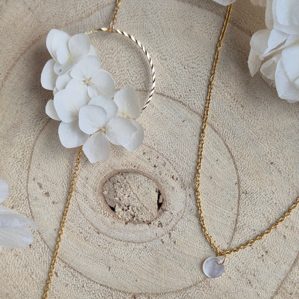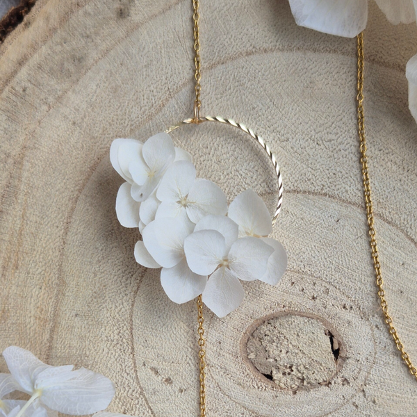 Ce collier ras de cou est orné d’une pampille en nacre, apportant une lumière douce et irisée à votre tenue. Il se prolonge d’une chute de dos de 38 cm, décorée d’un anneau effet torsadé doré à l’or fin, rehaussé de fleurs d’hortensia stabilisées blanches, véritables symboles de pureté et de romance.