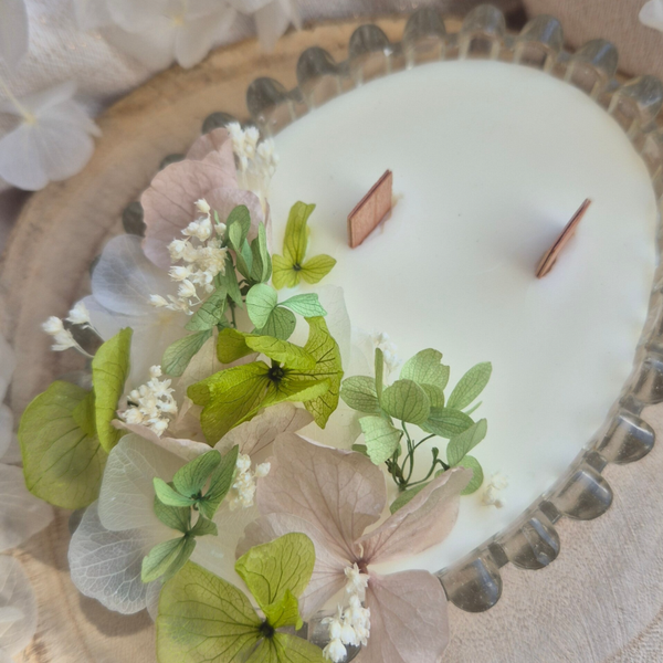 Bougie fleurie – délicatement parfumée à la fleur de coton, coulée à la main dans un contenant soigneusement chiné.